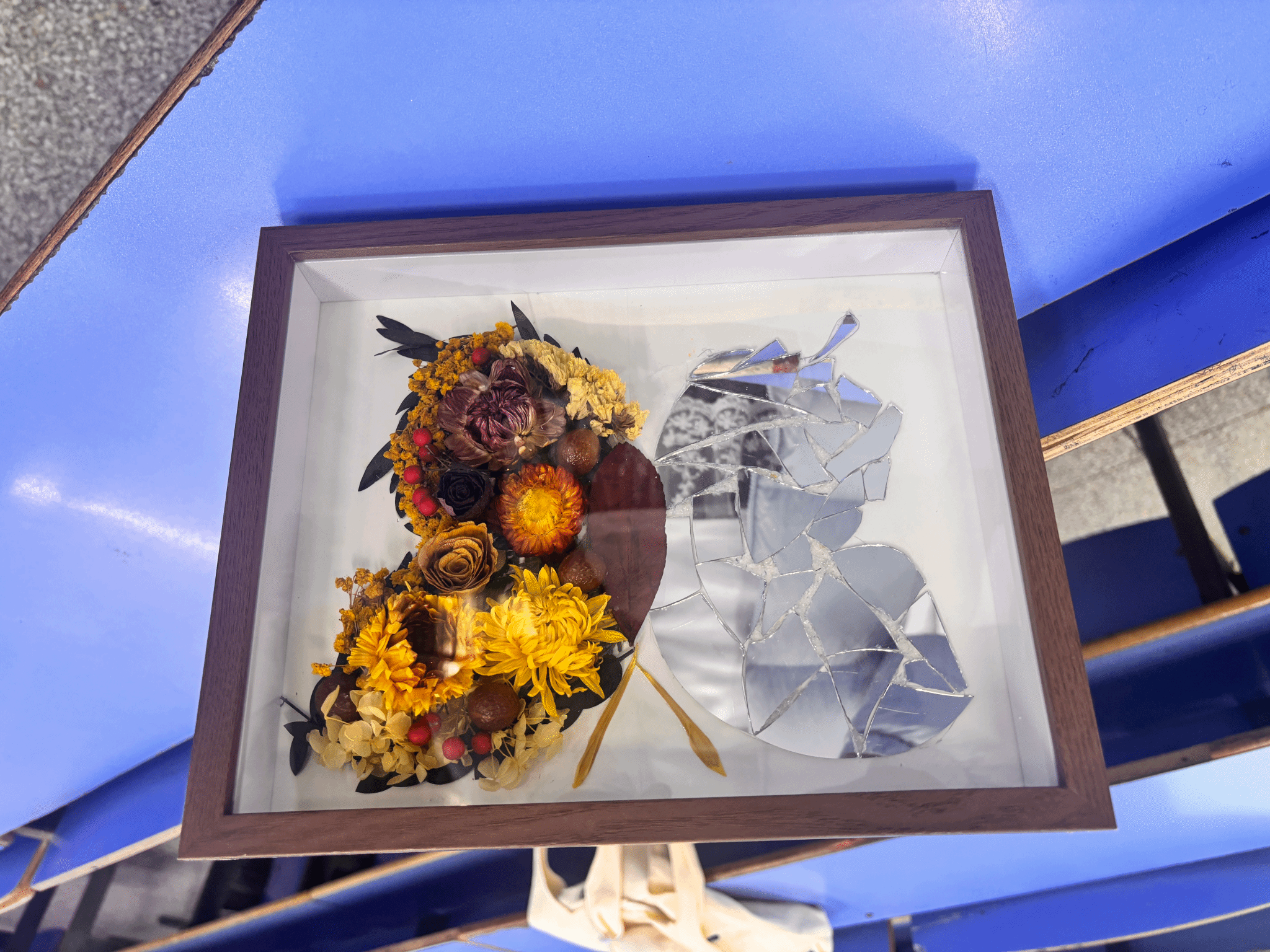 阳光落在相框内玻璃蝴蝶的翅膀上,折射的光影好似给了“蝴蝶”再一次翩翩起舞的舞台...活动伊始,来自24级生物科学四班的檀依灼带着充满创意的PPT及作品“半蝶琉璃梦”登台进行了汇报。檀依灼这样说到:“我想通过这件作品表达出不掩饰破碎,不回避残缺,重组是为了更美的未来这一核心观点。”其团队所带来的作品融合蝴蝶、叶片等自然元素坚定贯彻了源于自然归于生活的创作理念,在情感上引起共鸣的同时,成果引导了大家接受自己的“不完美”。比赛中这样富含深意的作品比比皆是,其中有的利用落叶制作了承载奇思妙想的魔法帽,有的利用废弃纸张和水晶制作了桌面摆件,有的......