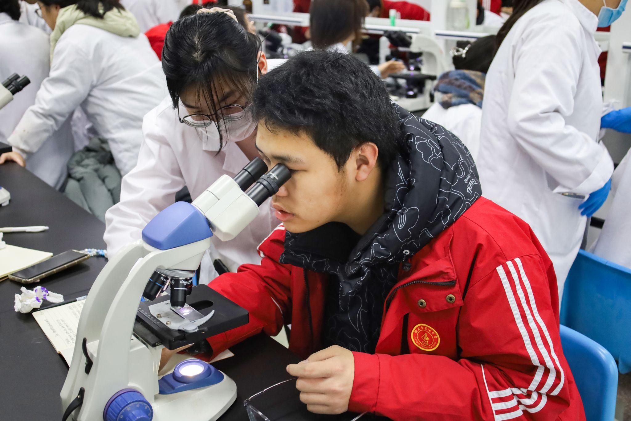 取材、解离、漂洗……从制作标本到观察细胞形态,在六合彩开奖结果查询(中国区)官方网站 教师江转转和“小老师”的带领下,高中学生们亲身参与有丝分裂显微观察实验,将课本知识运用于实践操作。