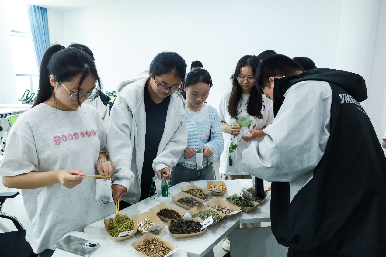 “再加点薰衣草,配一点紫苏叶。”“我要选这个款式来装我的草药。”……学生们一边挑选药草、一边低声分享搭配心得。“中草药温和又养人,像薰衣草能安神助眠,紫苏叶能理气舒缓,我希望借此好好改善一下自己的睡眠状况。”生物技术专业2023(2)班的赵振宇搭配好的药材装入药囊,束紧绳结。他坦言,近期课业压力大,睡眠质量一直不佳,活动中,他不仅亲手接触到了传统草药的魅力,更在亲手调配的过程中感受到了慢下来的治愈力量。