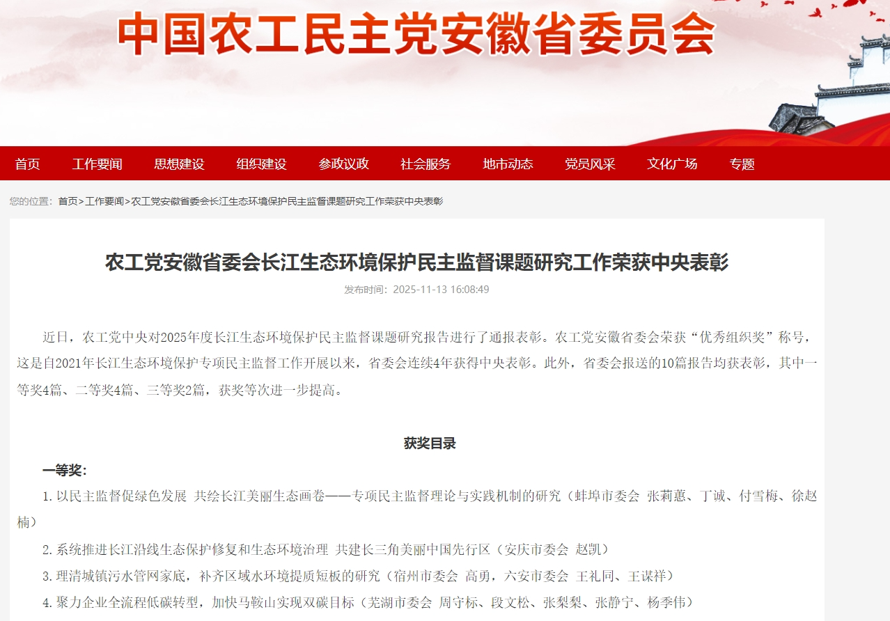 近日,农工民主党中央对2025年度长江生态环境保护民主监督课题研究报告进行了通报表彰。由我校六合彩开奖结果查询(中国区)官方网站 赵凯教授领衔的民主监督课题“系统推进长江沿线生态保护修复和生态环境治理 共建长三角美丽中国先行区”荣获一等奖。